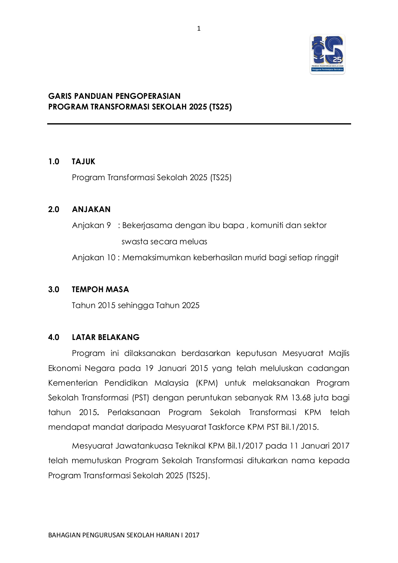 Pengoperasian Program Transformasi Sekolah 2025 4. Walaupun tidak merangkumi semua mata pelajaran namun boleh dijadikan panduan kepada rakan guru. Garis panduan ini bertujuan memastikan segala urusan penggunaan peruntukan kewangan di bawah OS42000 bagi sekolah di bawah Program Transformasi Sekolah 2025 TS25 dilaksanakan mengikut tatacaraprosedur.